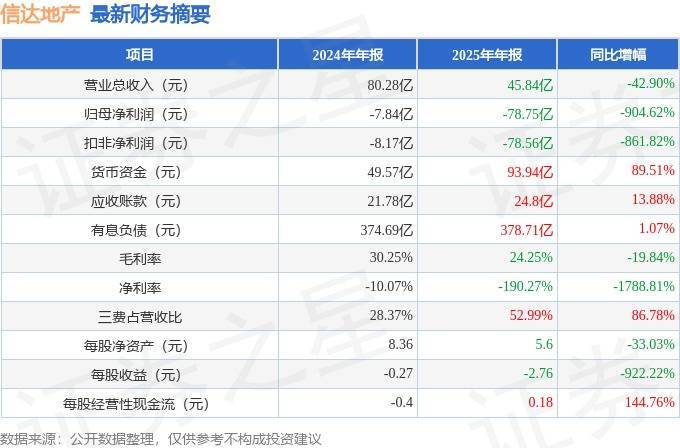 据证券之星公开数据整理,近期信达地产(600657)发布2025年年报。截至本报告期末,公司营业总收入45.84亿元,同比下降42.9%,归母净利润-78.75亿元,同比下降904.62%。按单季度数据看,第四季度营业总收入18.92亿元,同比下降58.23%,第四季度归母净利润-25.66亿元,同比下降268.11%。本报告期信达地产三费占比上升明显,财务费用、销售费用和管理费用总和占总营收同比增幅达86.78%。